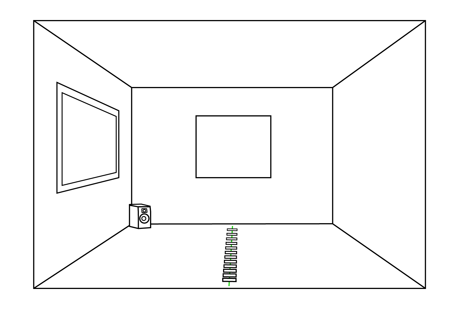 Measure your room and mark a line in the middle of your room, front to back. If you aren’t sure which direction you will be facing, you can do this test in both room orientations. You can use tape, string, or a laser to create the line on the floor.